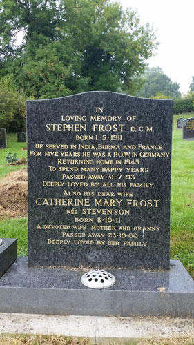 Stephen Frost’s DCM was announced in the London Gazette dated 25th October 1945. He was taken Prisoner of War during the retreat to Dunkirk, possibly in the same action for which he was awarded the DCM, and interned in Stalag 344 in Lambinowice, Poland. It is unclear which battalion he was with. The 1st Bn was heavily involved in the Battle of Ypres-Comines Canal 26-28 May and suffered 300 casualties. The 4th Bn was encircled and overwhelmed at Watou. The 1st Bucks Bn (Ox & Bucks) made a heroic stand at Hazebrouck against the 8th Panzer Division on 27/28th May being eventually overwhelmed and 336 men being taken POW. It is likely the DCM was for 1 of these 3 actions. This group is offered together with a copied photo of his headstone in St Botolph churchyard, Newbold on Avon which reads “In loving memory of Stephen Frost D.C.M. born 1/5/1911. He served in India, Burma and France, for 5 years. He was a P.O.W. in Germany returning home in 1945 to spend many happy years. Passed away 31/7/93.”