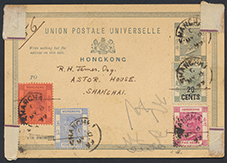 Lot 93, a Hong Kong postal history collection, featured an unusual and attractive uprated franking on a 4d postal stationary card used in Shanghai, as well as a few other interesting items from Macao and Shanghai - noting a couple of 1910 Macao bisect covers and a 1945 Shanghai to GB internee cover bearing an 'Internee mail free / of postage / Shanghai PO' boxed cachet. Even with slight condition faults noted across the collection, the lot still sold for a very strong £1,300.