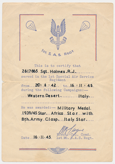 Sold with original SAS Certificate of Service with 1st SAS Regt from 20/1/42 to 16/11/45 in Western Desert and Italy dated 16/11/45, larger SAS Certificate un-named, Soldier’s Service Book, SBS embroided blazer badge, The SBS in WW2 book by Gavin Mortimer (where he is heavily featured), various copied photos and copied Buckingham Palace letter of issue for MM. His SAS Certificate confirms his other medal entitlement as 1939-1945, Africa (8th Army bar), Italy Stars (also entitled to BWM).