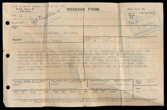“On 5th March 1941, Sergeant Matthews was Air Gunner in a Blenheim aircraft flown by Flt Lt MacArthur. Half a mile west of Fastnet Rock off the south coast of Ireland, two Heinkel 111 aircraft were encountered and attacked. During the ensuing fight, Sergeant Matthews was severely wounded in the left shoulder. Despite this injury, he continued to man his turret and during the return flight of 30 minutes, Sergeant Matthews was continuously in touch with his base by W/T. This NCO was mainly responsible for the safe return of the aircraft.”