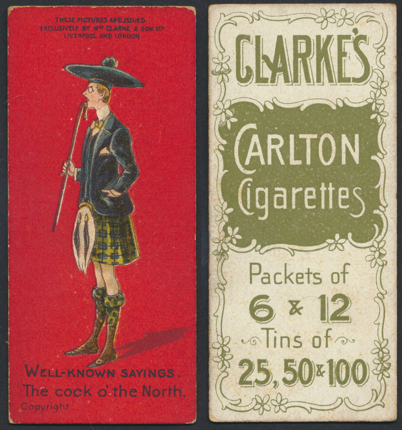 William Clarke & Son, founded in 1830, was a prominent Irish tobacco manufacturer. In the early 1920s, tobacco advertising designed to attract and retain consumers expanded rapidly, and Clarke’s products were promoted through a wide range of materials, including advertising signs, coupons and cigarette cards. In 1924, Clarke’s were acquired by Ogden’s and with such a short production period their cigarette cards are highly sought after and very desirable for any private collector and dealer.