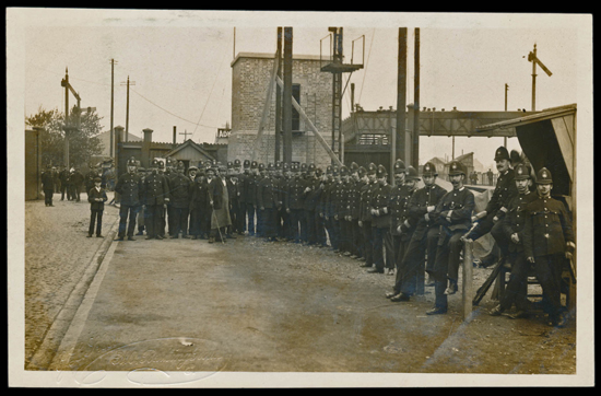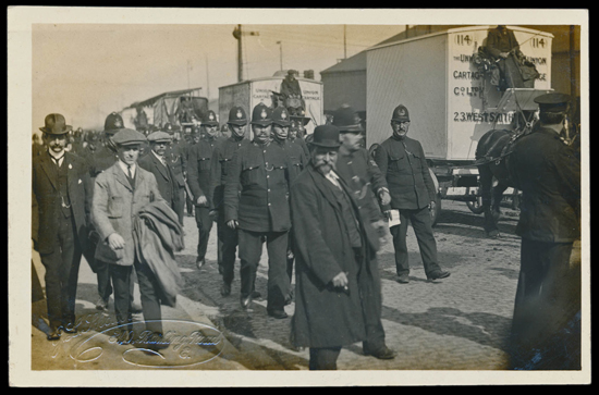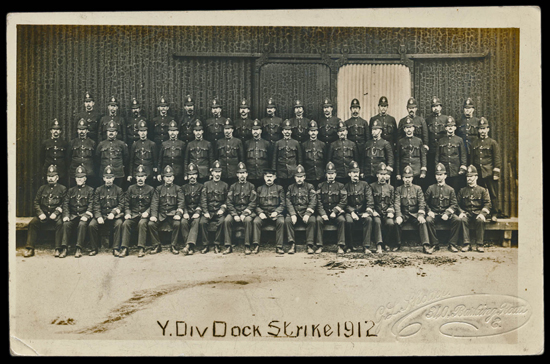 Y Division of the Metropolitan Police find the time to pose for a group photograph, with dock warehouses in the background. The sender of the card is one of the policemen on duty. He states “Am down at the docks on strike business. Have been here since Whit Monday. Have had quite enough of it – 17 hours a day.”