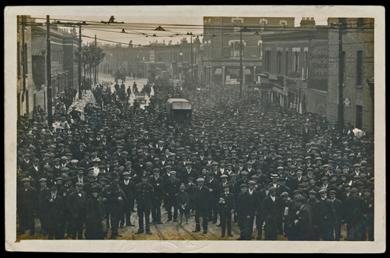 A vast crowd of striking dockers with 2 policemen in the foreground, at the corner of Peter Street.