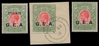 During the 1st World War the German Colonial forces in German East Africa fought a long defensive campaign until in 1917 the Allied Forces took the area that later became Tanganyika. When the area came under civilian control stamps from East Africa & Uganda were overprinted with ‘G.E.A’ for usage. The auction included a 1917-21 ‘SPECIMEN’ set which sold for £408. A used set to 50r sold for £990 and a mint set for £630.