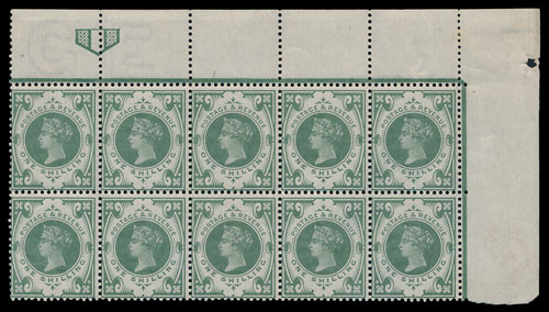 There were some attractive Queen Victoria mint blocks, amongst which an 1887-92 Jubilee 1s in a corner marginal block of 10 sold for £1,380.