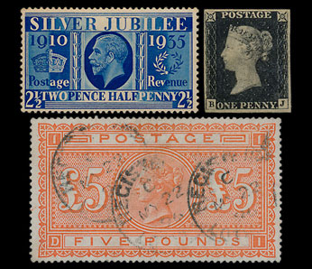 In the Great Britain section an 1840 1d black plate 1b achieved £840, an 1867-83 £5 orange sold for £1,170. A fine looking example of the rare & sought after 1935 Silver Jubilee 2½d in Prussian Blue reached £3,480.
