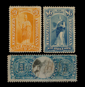 The lots also included more unusual Back of the Book issues, including a Newspaper 1875 $6 which went for £360, a $9 for £300 and an 1871 Revenue 50c with inverted centre sold for £240.