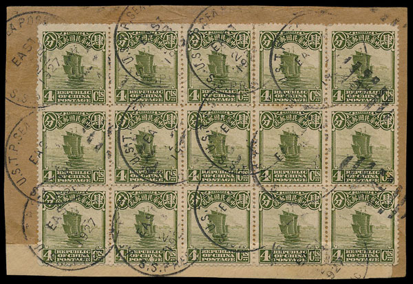 Also in the foreign section, a China 1922-33 2nd Peking 4c in a block of 15 sold for £216. The stamps themselves have little value, what makes this multiple more interesting is that it is cancelled ‘U.S.T.P. SEAPOST/EAST/FEB/11/1927/S.S. PRES MCKINLEY’ showing it was carried on board the President McKinley, a ship operated by the Admiral Oriental Line shipping company, to carry passengers and mail to & from Asia across the Pacific. The Pres McKinley was later used as a troop ship in the 2nd World War & eventually broken up in 1949.