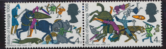 Three years after his first stamp design – the National Productivity Year set (1962) – postmaster general Tony Benn encouraged Gentleman to experiment with the traditional format of British stamp design. Gentleman responded by replacing the previously mandatory large photograph of the Queen with a smaller silhouetted cameo profile derived from Mary Gillick’s coinage head (although originally he had suggested removing it altogether). This change gave designers far more freedom and allowed for much larger pictorial designs.