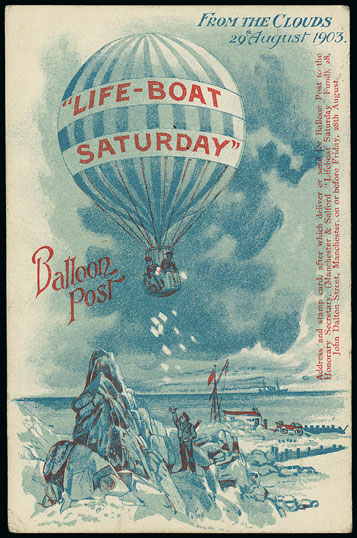 A month after this successful flight, a balloon post was organised for the benefit of the Lifeboat Saturday charity. The balloon took off from the Manchester Botanical Gardens and 4,000 cards were printed and dropped over Haslingden and Clitheroe. It is thought that as few as 4 cards have survived and one was sold in auction in 1983 for £1,675.