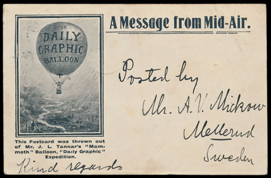 The fifth balloon post flight was organised in 1907 to publicise the Daily Graphic. 15,000 cards as well as a number of publicity booklets were flown from the Crystal Palace and travelled a distance of 760 miles, before the balloon crash landed in southern Sweden. A large number of the cards were recovered (as well as the 3 aviators) by a local Swedish school-master, who forwarded them to the addressees. These are the commonest of the early British balloon post cards and Warwick and Warwick sold one in 2011 for £240.