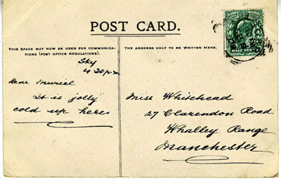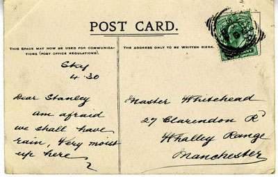Our June 2010 auction contained not one of these rare cards, but two! They were despatched by a father to each of his two children and on them he indicates the sender’s address as Sky. On his daughter’s card he writes 'It is jolly cold up here' and on his son’s 'Am afraid we shall have rain. Very moist up here.' They both received the Ongar c.d.s. before being sent back to Manchester. They realised £920 each.