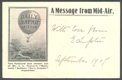The Daily Graphic was a mass circulation newspaper in the Edwardian era and sponsored a 1907 balloon flight, as an advertising venture. They printed hundreds of miniature booklets about the flight, which the aviators planned to jettison en route as ballast, in the way that earlier balloon pilots had jettisoned sand to maintain the height of the balloon. The coal-gas filled balloon, named Mammoth, took off from Crystal Palace, London, at 5 pm on October 12th 1907, with a crew of 3 and 15,000 postcards and drifted for 20 hours and 30 minutes over the North Sea and Denmark, eventually crash landing near the village of Brackau, near Mellerud, in southern Sweden. The crew escaped unhurt but the balloon careered on for a further 30 miles, scattering its load of postcards over a considerable area. Some cards were found and forwarded to the addressees from Tosse, where the balloon eventually came to rest, but the majority were recovered over a period of several weeks by the Mellerud schoolmaster, Mr Mickow, who had played host to the aviators when they arrived at his door after the balloon’s crash landing.