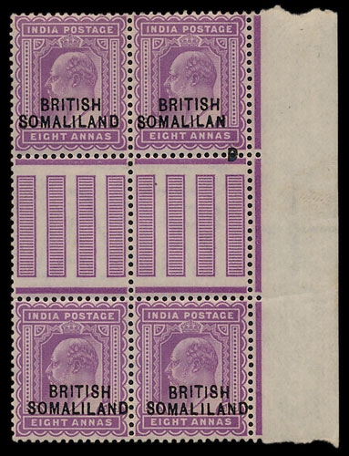 Control of the area was eventually passed to the Foreign Office and in 1901 the Indian Government responded to a request for an emergency issue of stamps by overprinting 13 Queen Victoria values to 5 rupees with ‘BRITISH SOMALILAND’. Distribution of the stamps was postponed for some time due to military operations against the ‘Mad Mullah’ and his Dervish Army who spent decades waging a guerrilla war against British control.