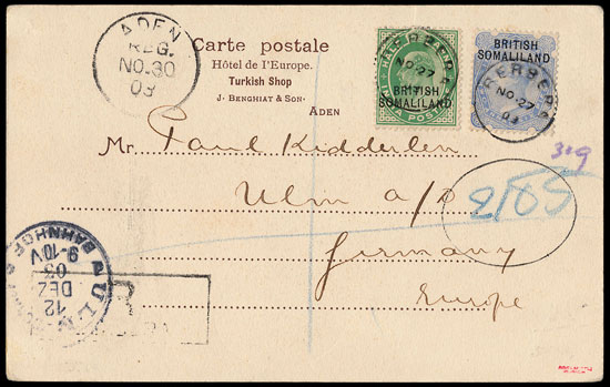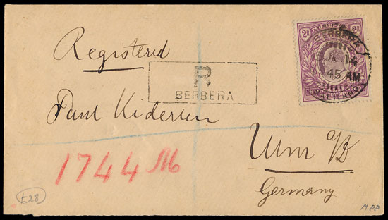 The collection also has some interesting covers, including a postcard to Germany with Berbera cancels.