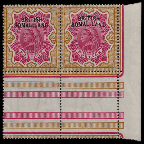 The auction includes a 2a pale violet with double overprint, a 2½a pair with ‘BRIT SH’ variety and a 3r with ‘overprint double, both inverted with one albino’.