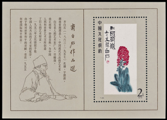 Lots 376 and 377 in our January philatelic sale are representative of Qi Baishi’s work. The first lot, a set of sixteen stamps with whimsical scenes of nature against white backdrops, features multiple depictions of flowers bursting with colour as well as feeding squirrels and tadpoles in a mountain spring. While lot 377 is a miniature sheet featuring Qi Baishi’s ‘Long live Motherland’ a bright red flowering plant that vividly stands out from the white canvas, and a pencil sketch portrait of Qi Baishi by modern painter Fan Zeng.