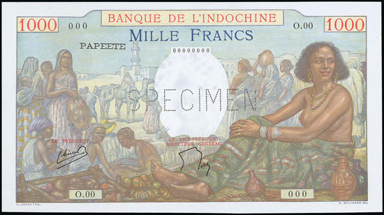 And this Tahiti 1940 1000 francs perforated ‘SPECIMEN’ banknote achieved £180.
