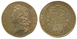 Moving on to the British milled section this 1739 two guineas realised £3,600. This 1739 guinea sold for £1,380, this George III emergency issue oval countermark dollar achieved £324 and this 1936 crown realised £600.