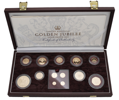 In the gold section modern coins proved popular with this 2002 Queen's Golden Jubilee £5 to Maundy proof gold set achieving £6,750.