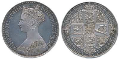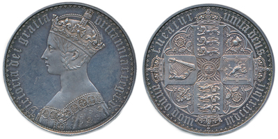 This 1847 Gothic crown with plain edge realised £8,000 and this 1847 Gothic crown graded about uncirculated sold for £6,500.