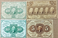 Lot 222 attracted very competitive bidding, USA. Range of fractional currency with 1862 First Issue Postage Currency 25 cents very fine plus (straight edges, ABNC on back), 10 cents extremely fine (perf. edges, no ABNC), 10 cents fine (straight edges, ABNC on back), 5 cents near extremely fine (perf. edges, no ABNC), 1863 Second Issue Fractional Currency 25 cents extremely fine (18-63 and S on back), 50 cents extremely fine (18-63 and R-2 on back), 1863 Forth Issue 10 cents extremely fine (blush tint, 40mm seal) and 25 cents extremely fine (blush tint, 40mm seal), eventually sold at an hammer price of £370.