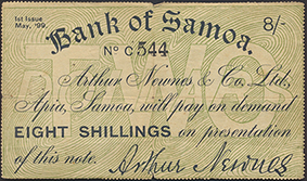 Moving on to banknotes, Lot 272 Samoa. Bank of Samoa promissory note for eight shillings issued by Arthur Newnes & Co Ltd. No. C544 1st issue May, '99. Fine sold for an astounding price of £1600 after a rival bidding war finally came to an end.