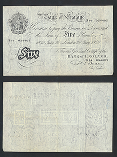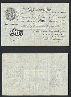 Next, we have lot 130 was a P.S. Beale consecutive pair of white £5 S14 054405 to ...406, plus Peppiatt £100 (2) and £50 forgeries, achieved a hammer price of £430.