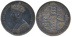 Lot 592, another 1847 Gothic crown, undecimo edge, dark blue toning to obverse, near extremely fine, sold for a total of £2,500.