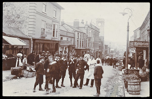 This card is typical of the wonderful social history cards produced by E.A. Bragg of Illogan, Redruth. It shows a group of boys in Fore Street, Redruth, on market day.
