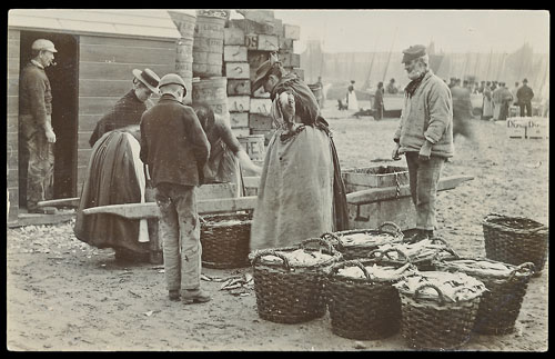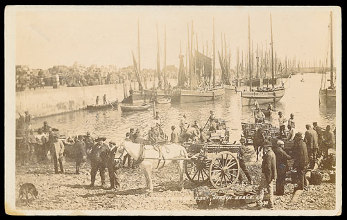 The fishing industry has always been important in Cornwall and Newlyn continues to be an important fishing port today. This card, by national publisher Valentines, depicts the mackerel fleet landing their catch.