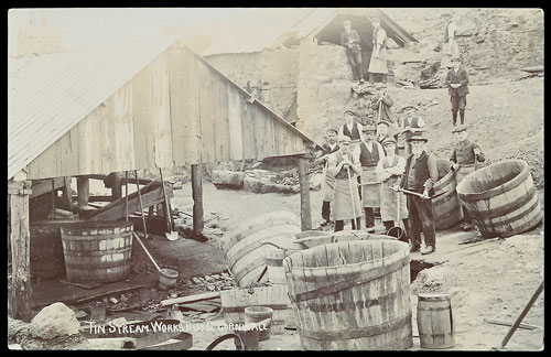 The publisher of this industrial card was S.J. Govier from the village of Chasewater near Redruth. It shows the tin streaming works at Bissoe. Tin was eroded from the primary mineral veins and re-deposited in alluvial gravels. Today this site at Bissoe is on a coast to coast cycling and walking route along the old mineral tramways. Panning for heavy minerals was a technique I used when employed in exploration geology in Australia. This is a rare industrial card.