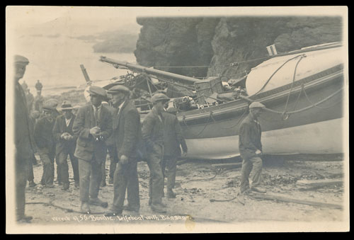 Shipwrecks are a common feature of the Cornish coastline. This card by A.H. Hawke shows the return of the Lizard lifeboat Frederick H. Pilley, in 1924, after rescuing 93 people from the White Star liner Bardic, which was aground on the Maenheere Reef. The liner was eventually towed to Falmouth.