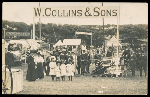 Helston was the venue for the Royal Cornwall Show in 1908. This detailed card by A.H. Hawke shows the stand of W. Collins and Sons, who were trading as seed, manure and implement agents.