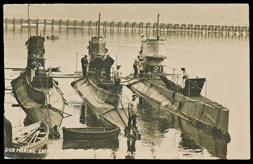 Three British Naval “sub marine ships” are shown in Falmouth harbour on this card which has no publisher details but probably dates to the period before the First World War.