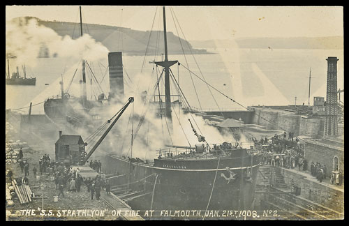 The Glasgow-built general cargo steamer “SS Strathlyon” was in dry dock at Falmouth in 1908 when an explosion occurred in the forward hold. The ship survived the fire and continued in service until she was bombed by the Germans in World War II. E.A. Bragg was on the scene to record the incident.