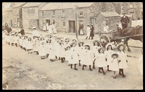 These little girls are taking part in a tea treat organised by the church at Lanner, near Redruth, in 1908. The premises of J. Willoughby, builder, contractor and undertaker are in the background. The publisher is unnamed.