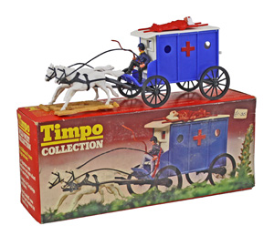 In our models section this Britains Racing Colours of Famous Owners ‘Mr F. T. Halse’ achieved £660 and this ‘Larch Hill Stables’ sold for £552. This Timpo Wild West 7thCavalry Field Ambulance Wagon No. 277 realised £192.