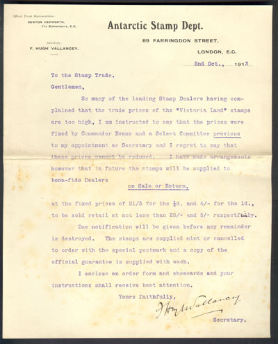 There was clearly an outcry from the collecting public at being asked to pay 600 times face value for the ½ d and 60 times for the 1d., as a circular from the Antarctic Stamp Department, addressed to the stamp trade, explained that the retail prices could not be lowered as they had been fixed by Commander Evans. However the stamp trade could purchase the stamps on a sale or return basis, with a moderate discount.
