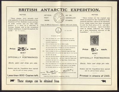 Elsewhere in this fascinating archive was a flyer published by the British Antarctic Expedition, which it distributed to stamp dealers wishing to sell Victoria Land stamps on behalf of the expedition. These stamps had been overprinted on the authority of the New Zealand Postal Department, primarily to raise revenue from collectors to help pay for Scott’s 1911 expedition to the South Pole. The ½ d could be purchased either mint or used with the expedition postmark at 25/- each and the 1d at 5/- each. The flyer bears the sentence “Dealers and the Expedition have agreed not to sell at lower prices.”