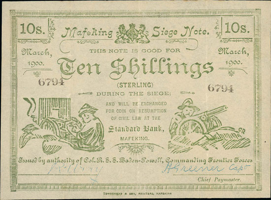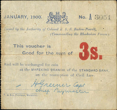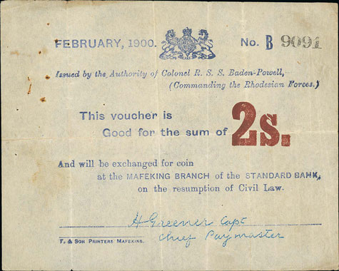 Arguably the best known action of the Second Boer War the Siege of Mafeking took place from October 1899 to May 1900. Due to the cutting off of supplies and the introduction of rationing Col. Baden-Powell, later to found the Scouting movement, ordered the issue of siege banknotes to facilitate commerce in the town.