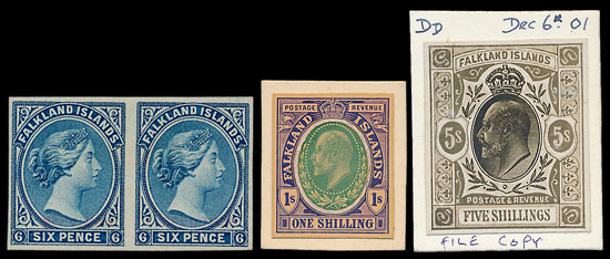1878-9 imperf plate proof 6d pair. 1904-12 1/- composite essay. 1904-12 5/- composite essay.