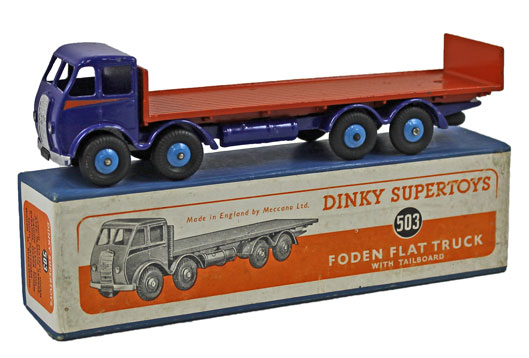 This Foden Flat Truck with Tailboard blue/ orange No. 503 is estimated at £220.