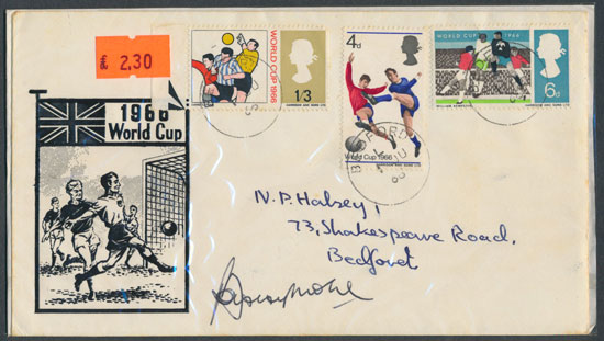 Lot 147 features all three of the special stamps released for the tournament: the 4d (Players with the ball), 6d (Goalmouth Melee) and 1s3d (Goalkeeper making a save). The stamps are arranged on an illustrated hand addressed cover and all individually cancelled.