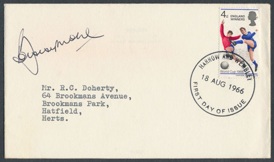 Lot 148 features the same 4d stamp with a slight alteration, where previously there had been a white space above the players heads the words ‘England Winners’ have been printed. This was a re-release specifically marking England’s tournament success. The cover is very neat in its presentation, with the plain envelope having a typed address and clear ‘Harrow and Wembley’ handstamp. Both covers are completed with the signature of the much celebrated Bobby Moore who captained the victorious 1966 squad.