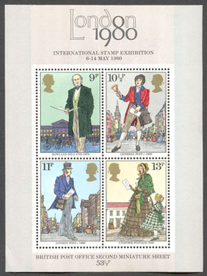 This time the error was on the 1979 Rowland Hill miniature sheet. As issued, the sheet contained denominations of 10p, 11½p, 13p and 15p. However, there had been rate rises prior to the issue of this commemorative set and the sheet in question contained denominations of 9p, 10½p, 11p and 13p. Of course, the entire stock should have been pulped, and how a few escaped the pulping is unknown. Only three had been reported at the time.
