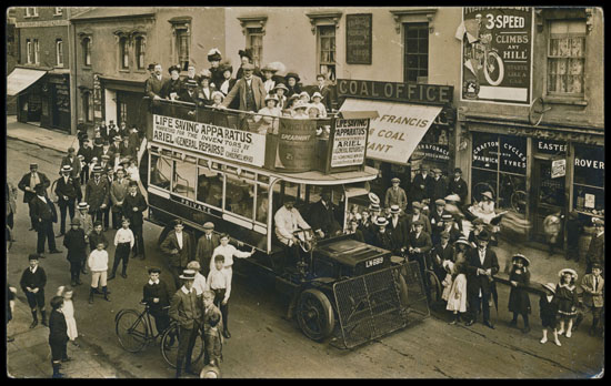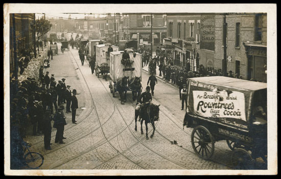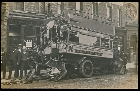 Lot 208 comprised 2 RPs of an accident in Highgate, between 2 trams and a motor omnibus. It realised £168, helped by a message describing the accident, written across the 2 cards.