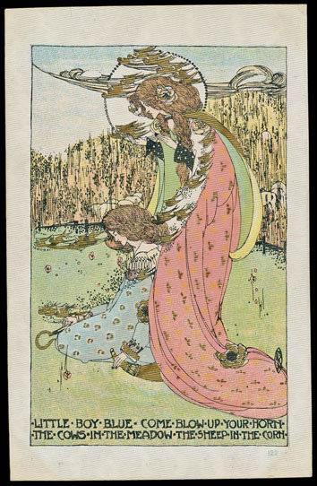 Childhood Memories: A beautiful postcard by Scottish artist Jessie King (1875 - 1949) from a set of 6 depicting nursery rhymes in an art nouveau style.