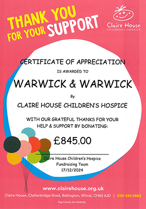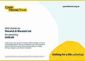 We support several charities and donated £450 to Cystic Fibrosis in January. Throughout 2024 we also donated several times to Claire House Hospice, a children's charity, with a total of £3,060. We donated £490 to The British Heart Foundation after the tragic loss of our dear friend and colleague Alan Smith. Alan was much loved by our viewers and the team here at Warwick & Warwick.