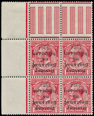 Following the signing of the Anglo-Irish agreement an Irish Provisional Government assumed power in 1922. Lacking their own stamps, the decision was made as an interim measure, to overprint existing British stamps until the Irish Free State were able to introduce their own definitive stamps in December 1922. During this period 3 different printers were instructed to carry out the overprinting, and, as is often the case, the combination of printers, types, techniques and errors created a new area of interest for philatelists to enjoy.